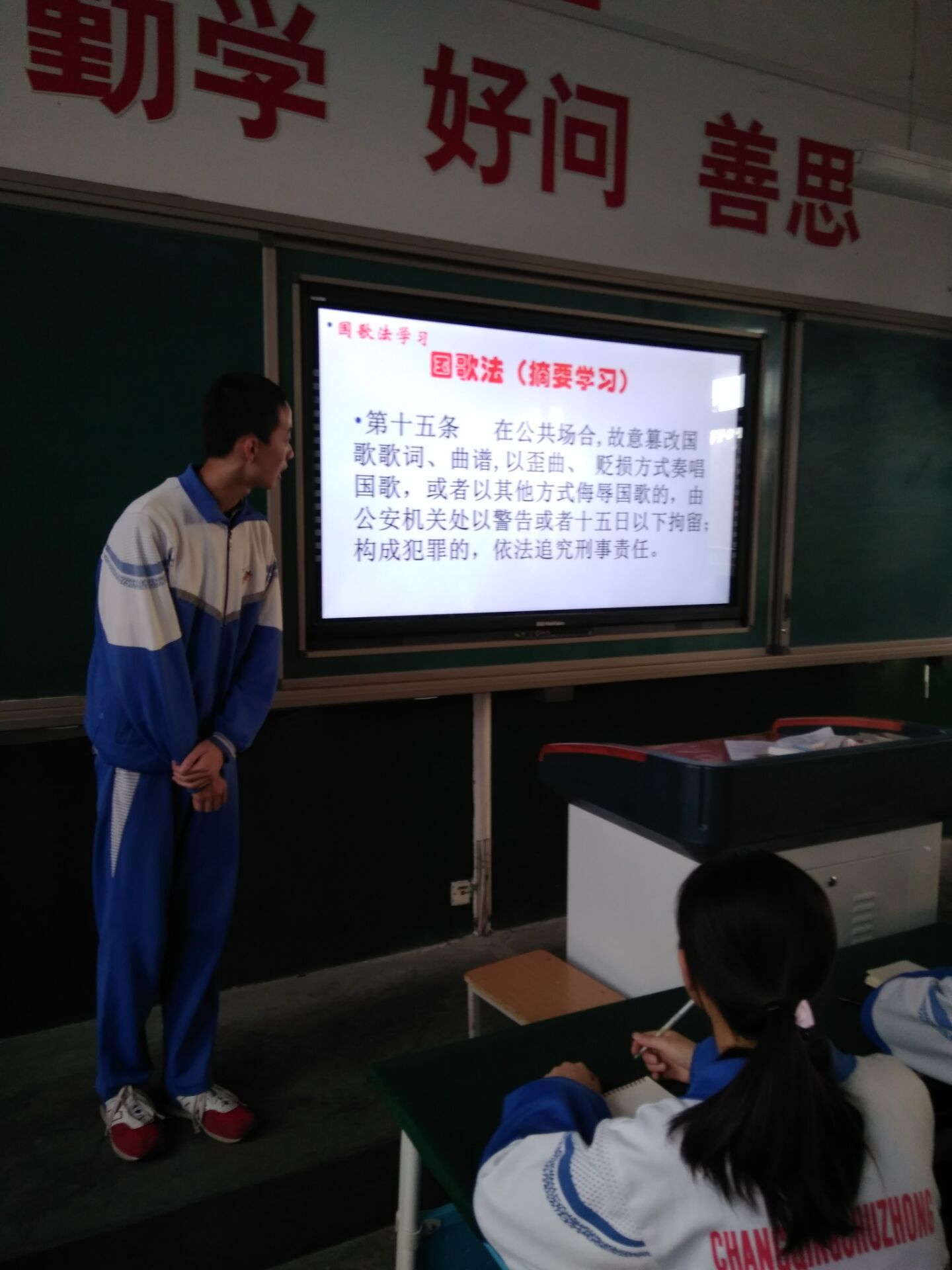 為(wèi)了維護國歌(gē)、國旗在學生心中的尊嚴,增強全校學生的國家(jiā)觀念和(hé)愛(ài)國意識,2018年10月30日,全校28個(gè)班集體(tǐ)利用班團(隊)課開(kāi)展了愛(ài)國主義教育暨《中華人(rén)民共和(hé)國國歌(gē)法》、《中華人(rén)民共和(hé)國國旗法》集中宣傳教育活動。