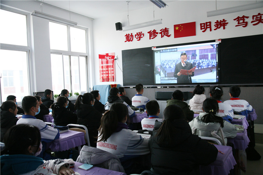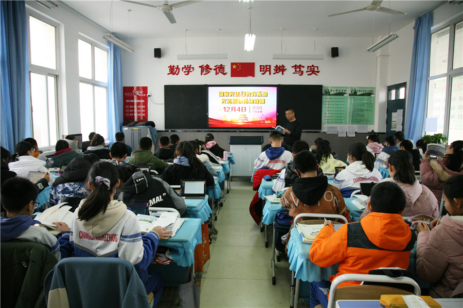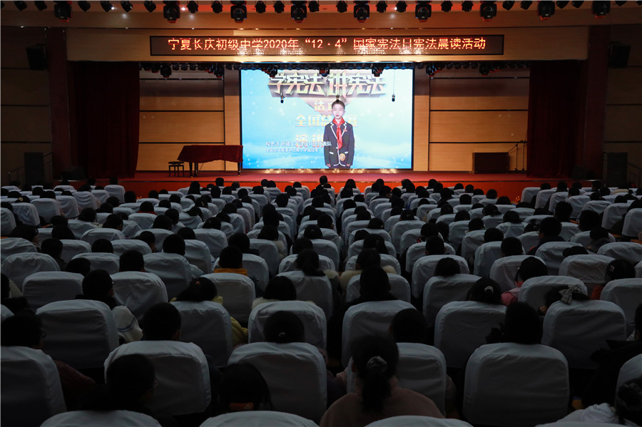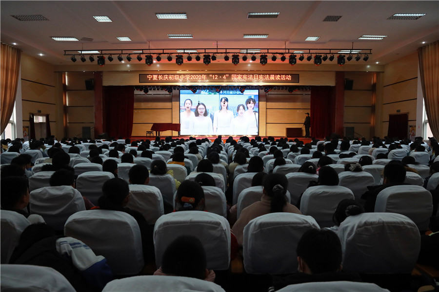 12月4日上(shàng)午,我校師(shī)生參加國家(jiā)憲法日中小(xiǎo)學晨讀活動,學校領導、任課教師(shī)和(hé)初二年級同學在學校一樓報告廳收看北京主會(huì)場(chǎng)的直播,一起誦讀憲法。初一、初三年級在本班教室收看直播。