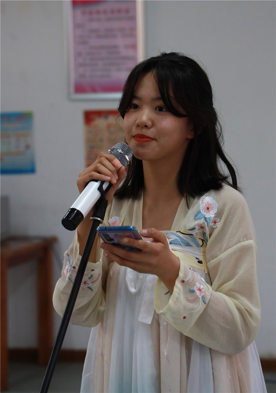 身穿漢服盛裝出場(chǎng)的同學獻唱(chàng)《煙雨行(xíng)舟》。