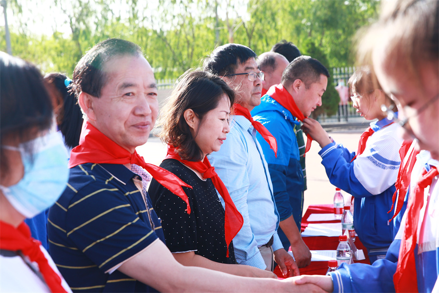 少(shǎo)先隊員為(wèi)主席台領導、嘉賓佩戴紅領巾。