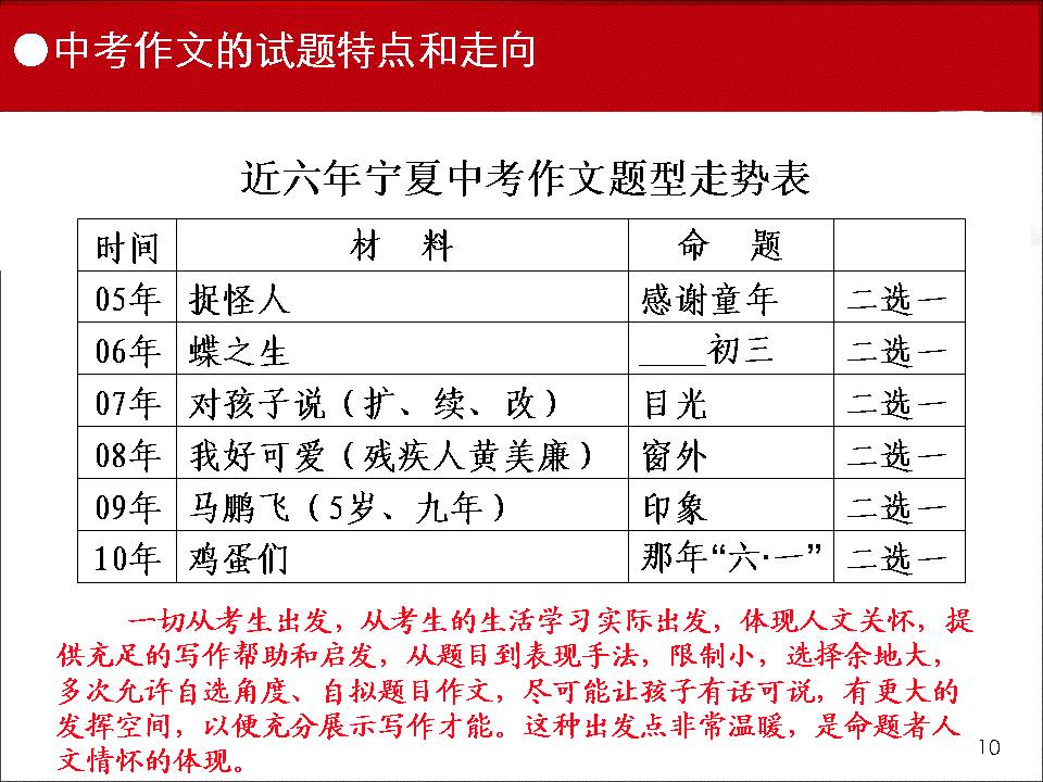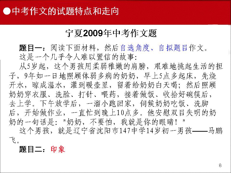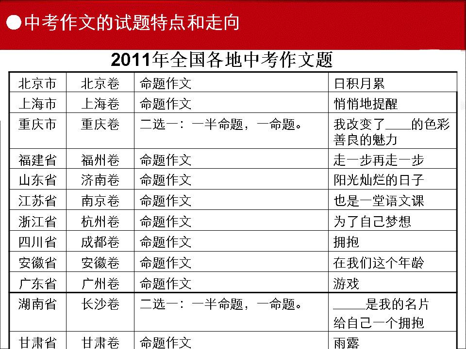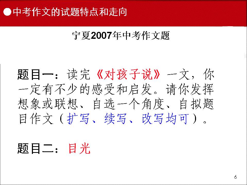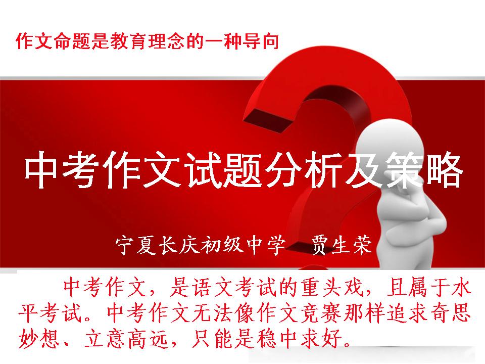 9月19--20日,2011年甯夏回族自治區語文學科中考研討(tǎo)會(huì)在銀川召開(kāi),大(dà)會(huì)由自治區語文教研員李澤琪老師(shī)主持,區教研室主任賀宏炜、副主任許燕萍、夏正建和(hé)小(xiǎo)龍人(rén)語文學習報總編黑(hēi)玉紅光臨會(huì)議,全區各地縣的語文教研員和(hé)各學校的初三備課組長200多(duō)人(rén)參加了會(huì)議。應會(huì)議的邀請(qǐng),我校賈生榮老師(shī)作了《中考作文試題分析及策略》的專題講座。現将該講座課件摘要發布。