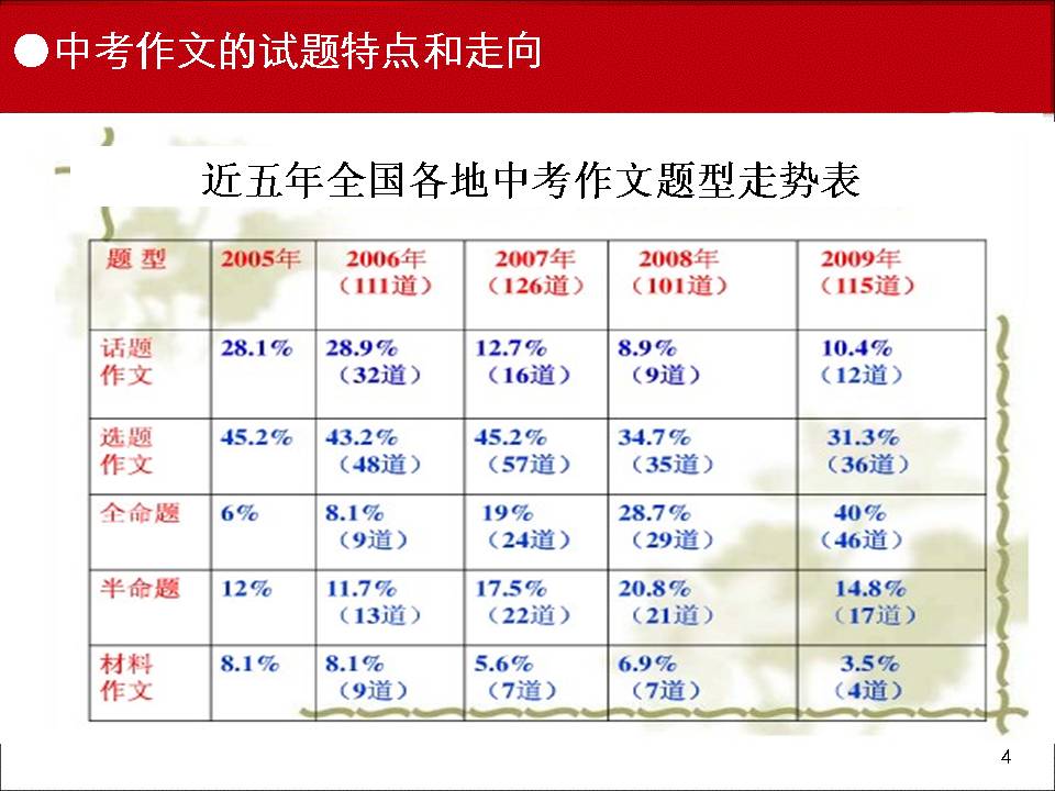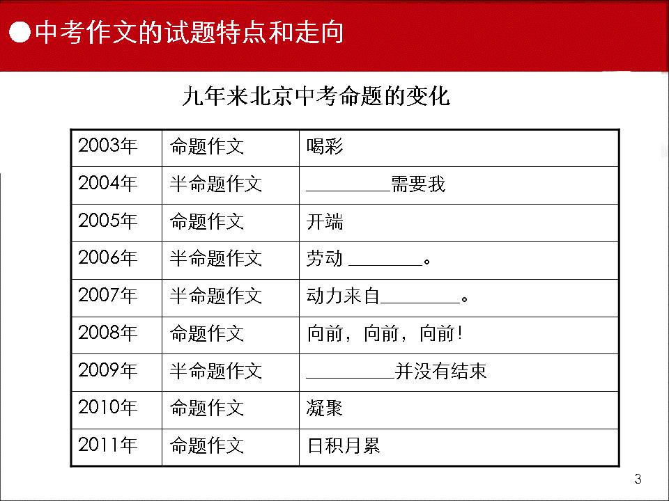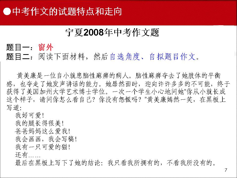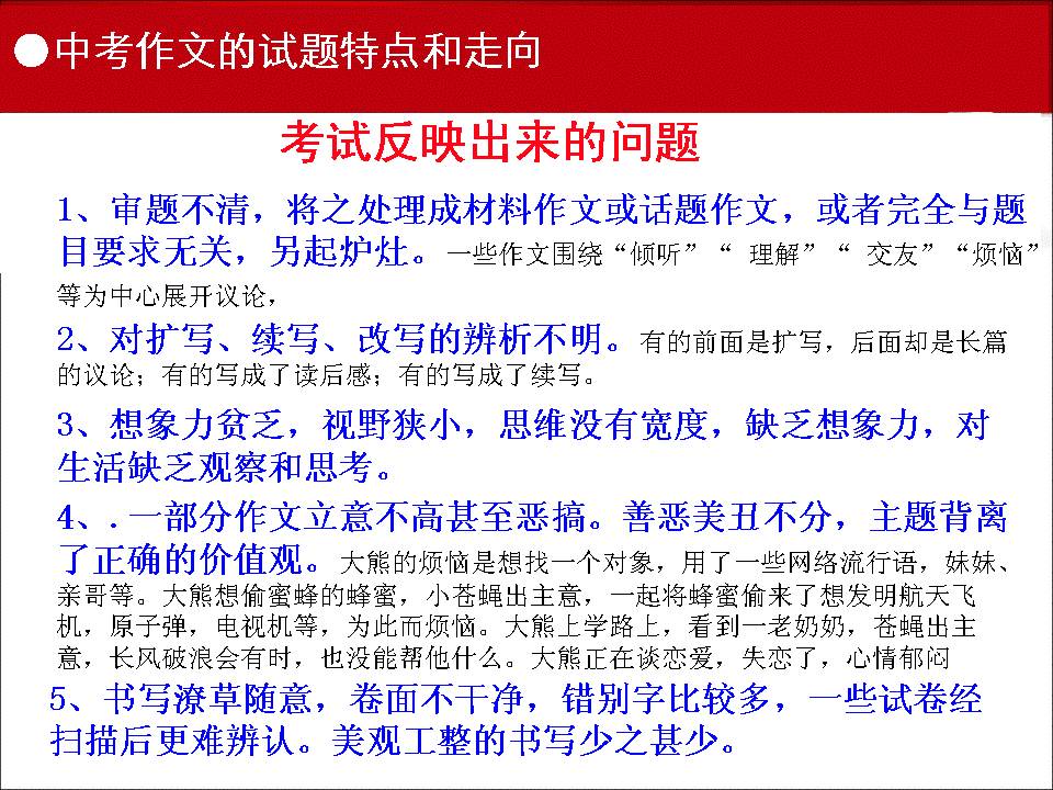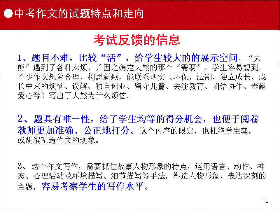9月19--20日,2011年甯夏回族自治區語文學科中考研討(tǎo)會(huì)在銀川召開(kāi),大(dà)會(huì)由自治區語文教研員李澤琪老師(shī)主持,區教研室主任賀宏炜、副主任許燕萍、夏正建和(hé)小(xiǎo)龍人(rén)語文學習報總編黑(hēi)玉紅光臨會(huì)議,全區各地縣的語文教研員和(hé)各學校的初三備課組長200多(duō)人(rén)參加了會(huì)議。應會(huì)議的邀請(qǐng),我校賈生榮老師(shī)作了《中考作文試題分析及策略》的專題講座。現将該講座課件摘要發布。