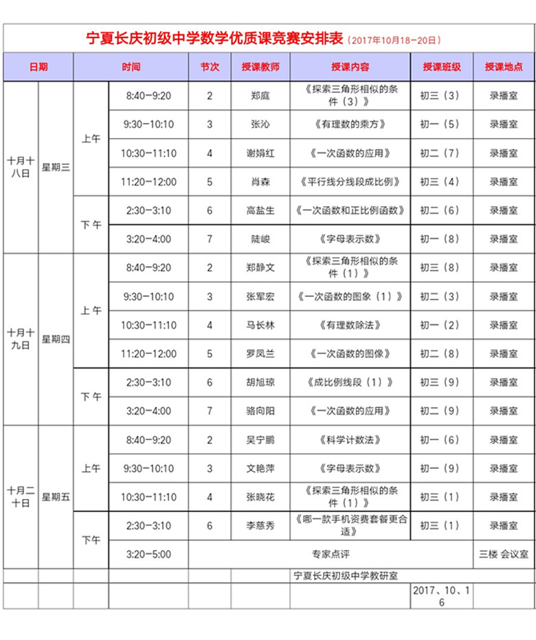 甯夏中衛中學數(shù)學優質課競賽安排表(2017年10月18—20日)